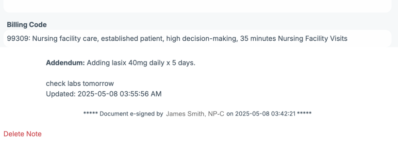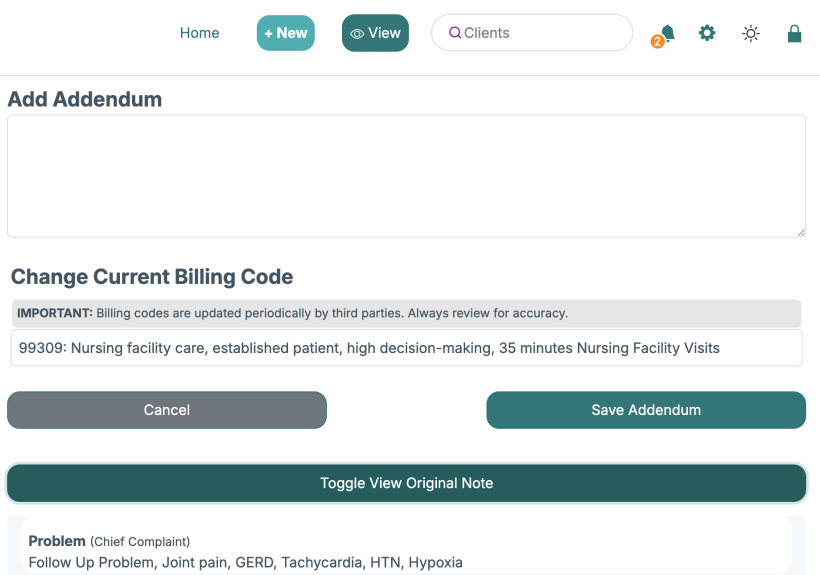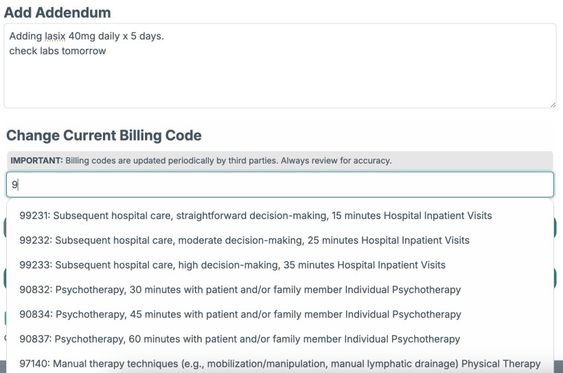 You can add text or change the billing code (CPT code) (optional). Then click "Save Addendum".