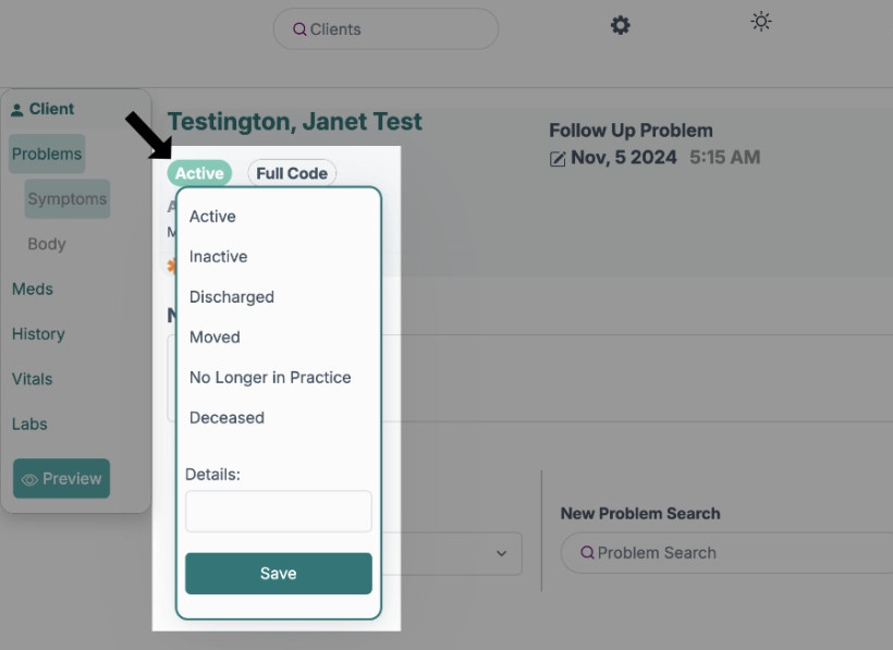 You can change the client's status by clicking the button below the client's name, and a drop down list appears. You can choose "Active, Inactive, Discharged, Moved, No longer in practice, Deceased" or enter a different status. It will save automatically.
