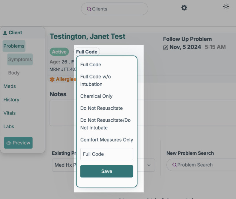 You can change the client's code status by clicking the button below the client's name, and a drop down list appears. You can choose "Full Code, Full Code w/o Intubation, Chemical Only, Do not resuscitate / Intubate, Comfort Measures Only, Discharged" or enter a different status. It will save automatically.