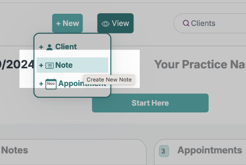 After logging in, click the "New Note" button. Select a client, or click the option to "create a new client".